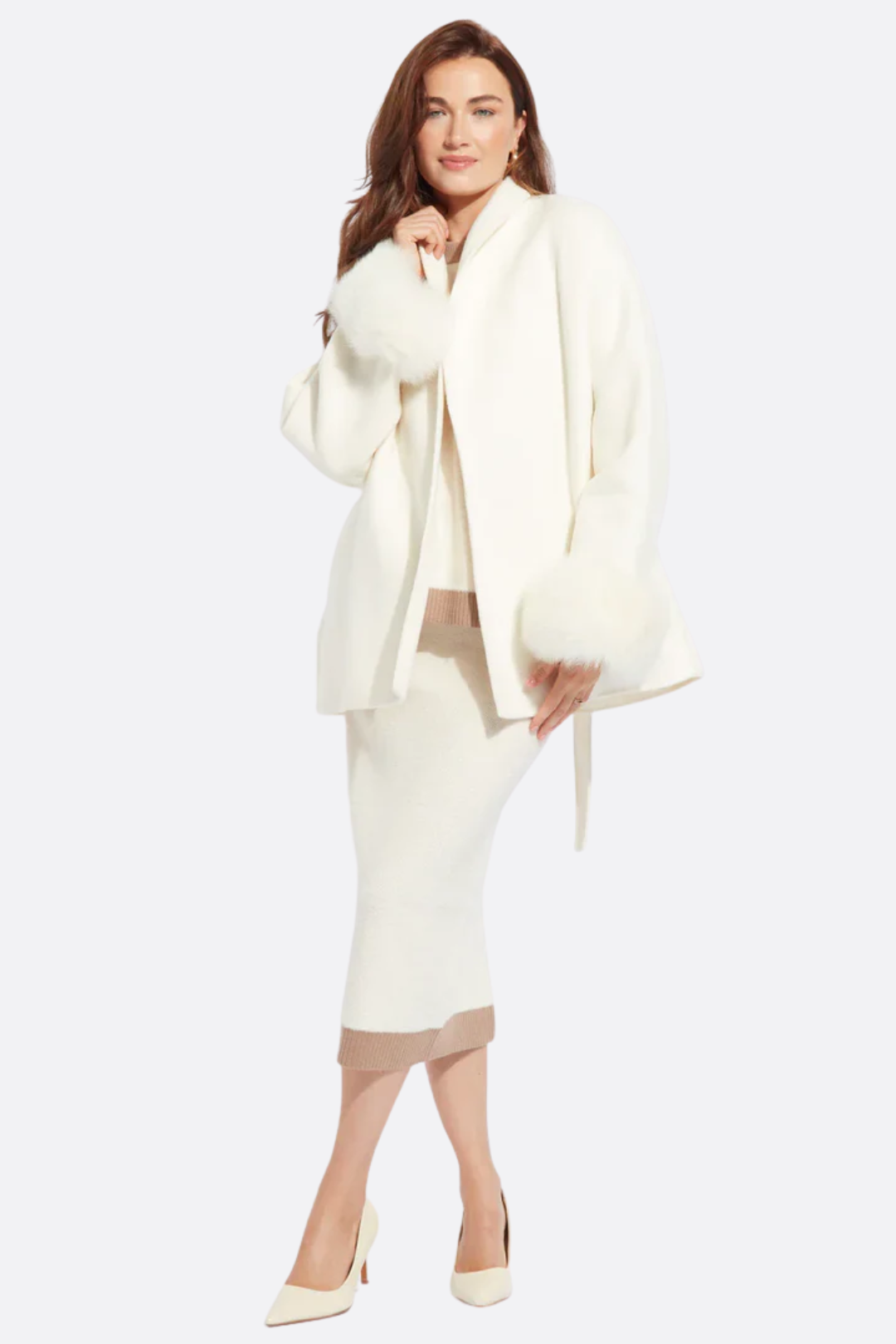 Wrap yourself in sophistication with our faux fur cuff coat, a chic blend of comfort and class. Designed in a soft, premium fabric for a smooth feel inside and out, it drapes effortlessly for a flattering silhouette.