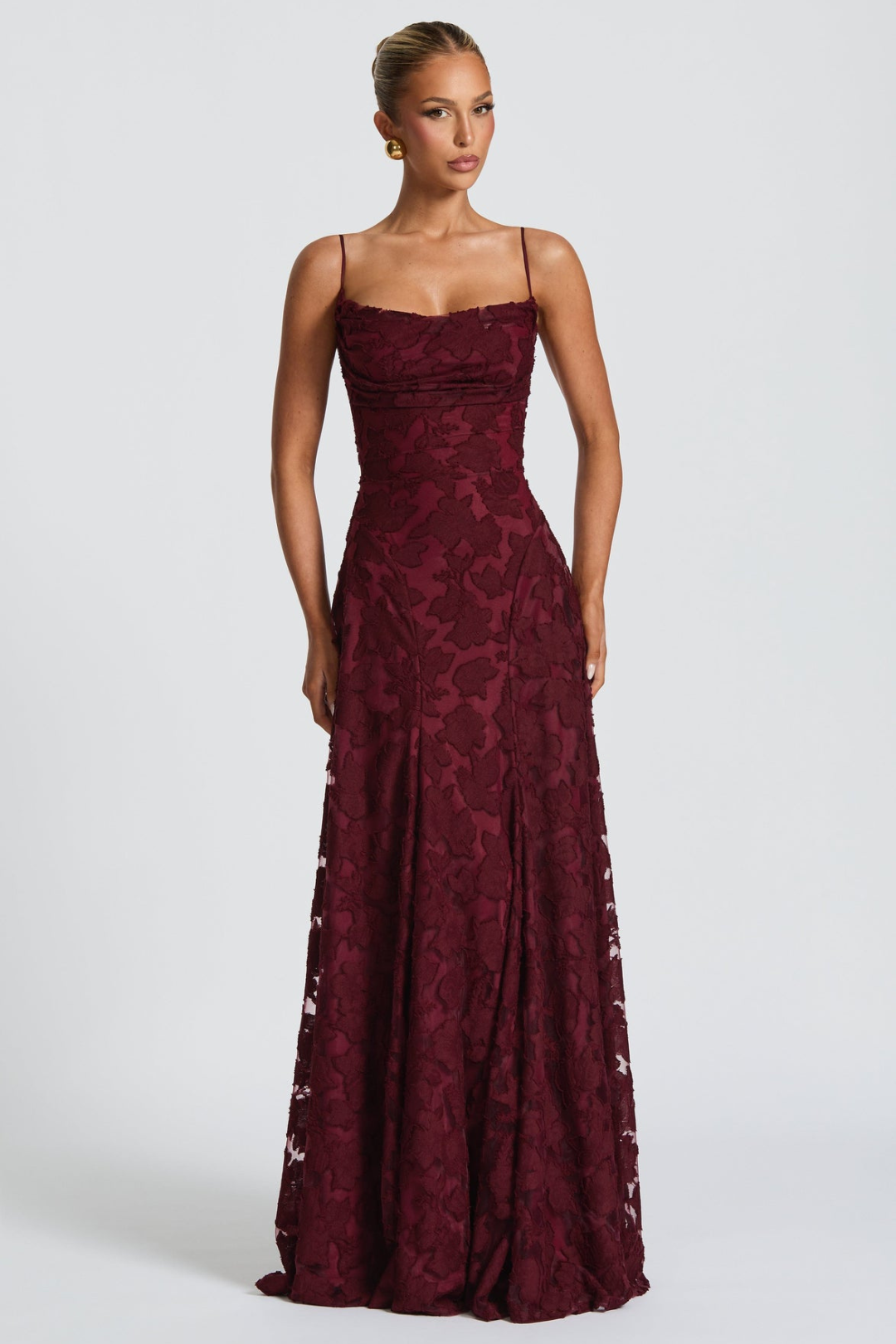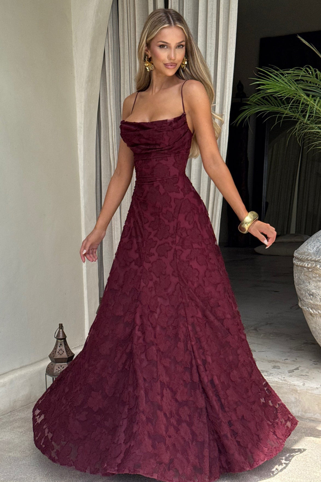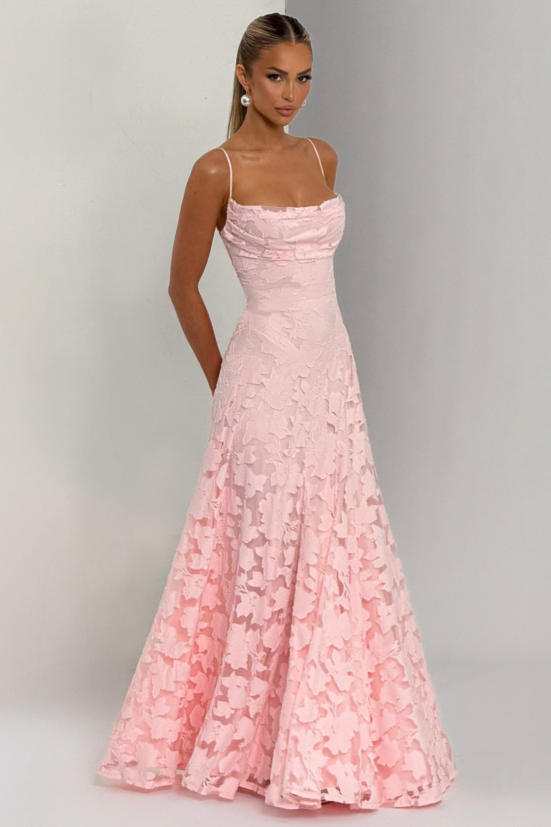 Step into effortless elegance with the Sarah Maxi Dress in Blush. Featuring a soft, draped V-neckline and a flowing full skirt with subtle godet panels, this gown moves gracefully with every step. The backless design with adjustable lace-up detailing creates a flattering, tailored fit. Perfect for weddings, romantic evenings, or special celebrations.