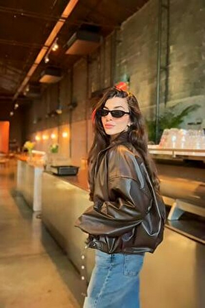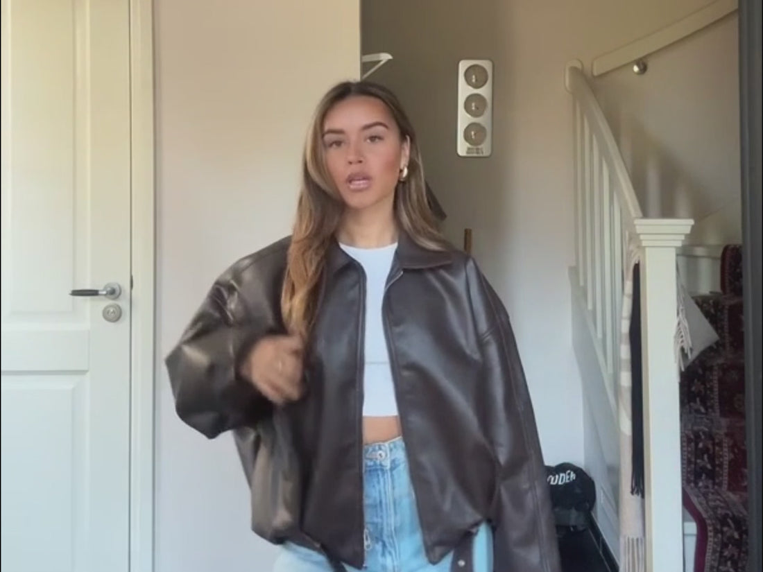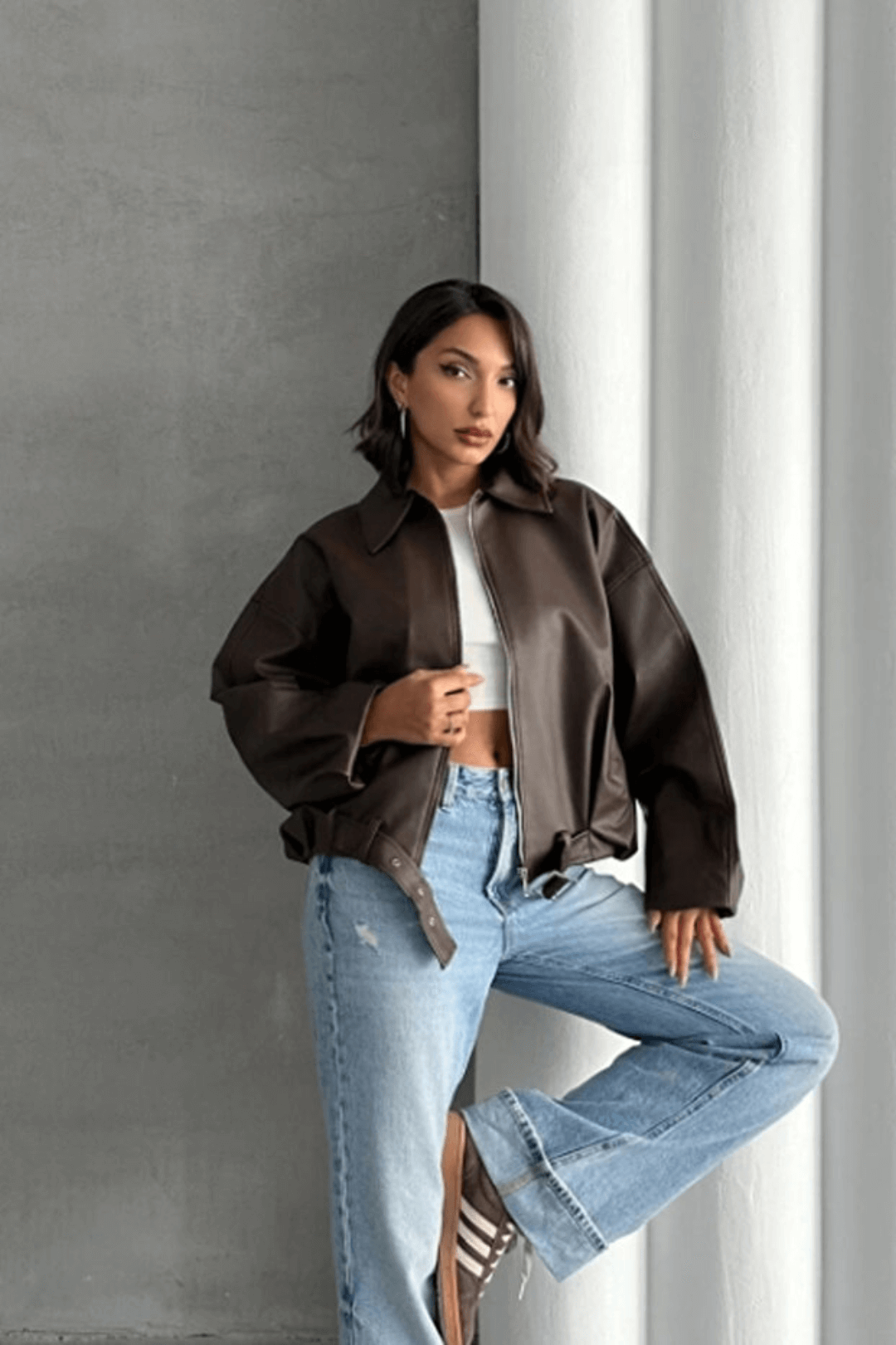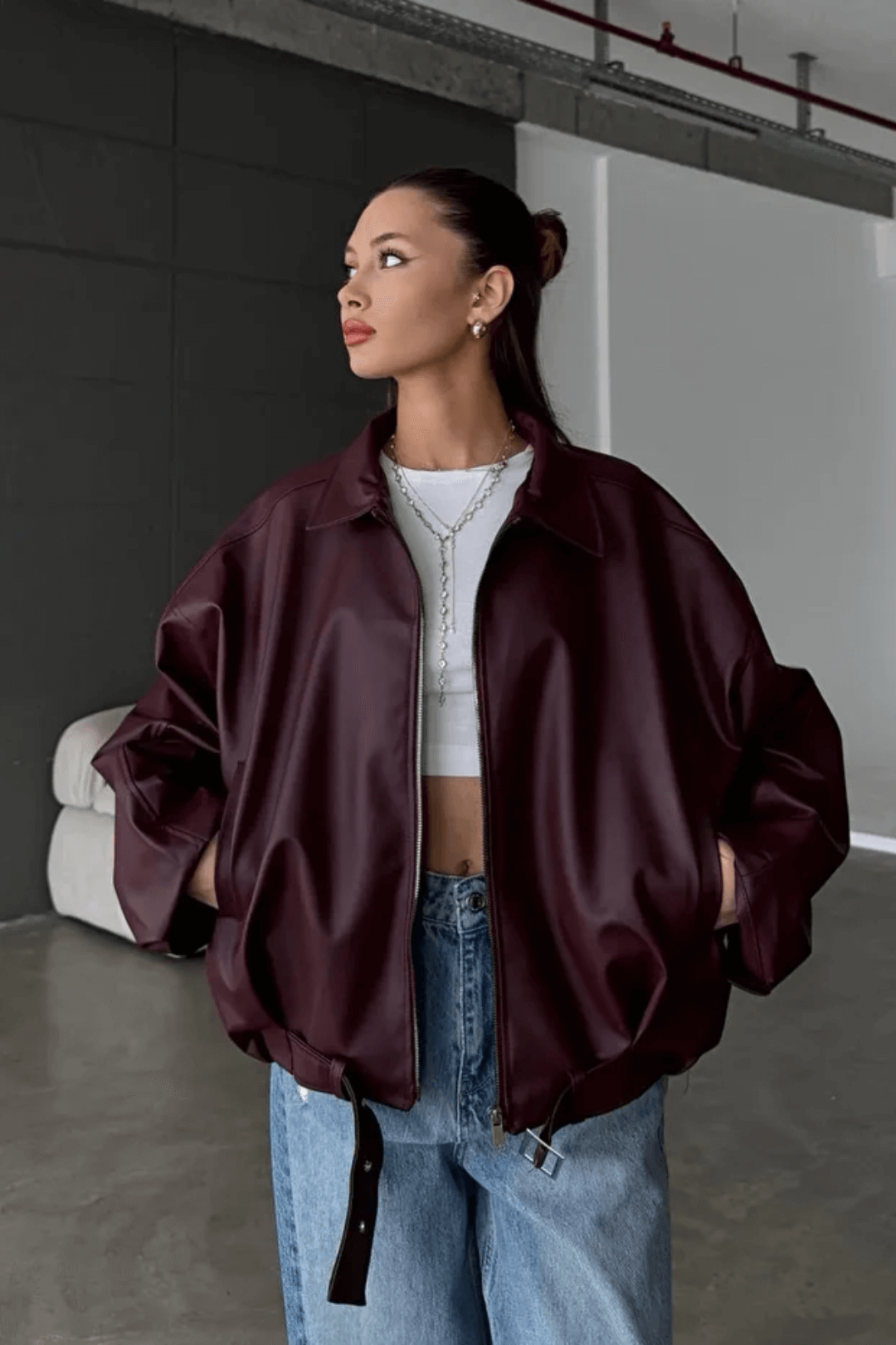 Show off a modern and bold style with this oversized faux leather jacket. Perfect for mid-season, it combines a loose yet structured fit with its classic collar and adjustable waist belt. The zip closure adds a practical and contemporary touch, making this jacket an ideal choice for comfort and trendiness every day.